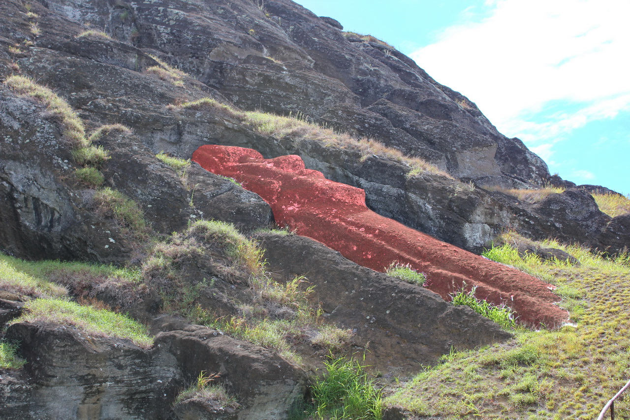 But Rano Raraku features moai in every stage of completion, from just laid out, to shaped but not separated from the rock, to standing and awaiting final details, and ready for transport. Statues were carved in a horizontal position and mostly completed while still attached to the natural rock by a backbone ridge.