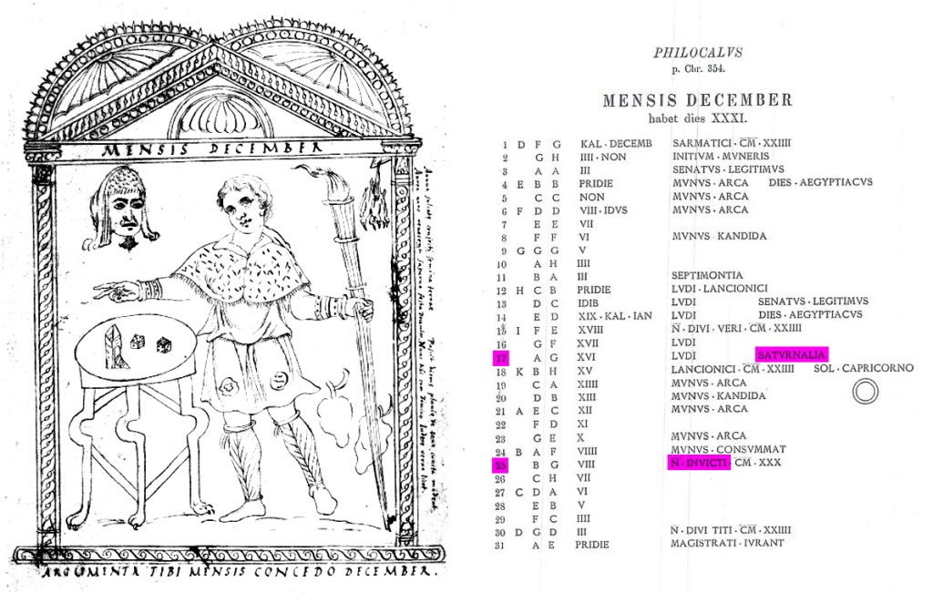 December in the Chronography of 354 with 25 December highlighted; illustrated facing page from the Barberini MS; Calendar: CM = Circenses missus (‘games ordered’), N = Natalis (‘birthday’), LVDI = games, Senatus legitimus = Senate allowed, Dies Aegyptiacus = Egyptian days (unlucky days)