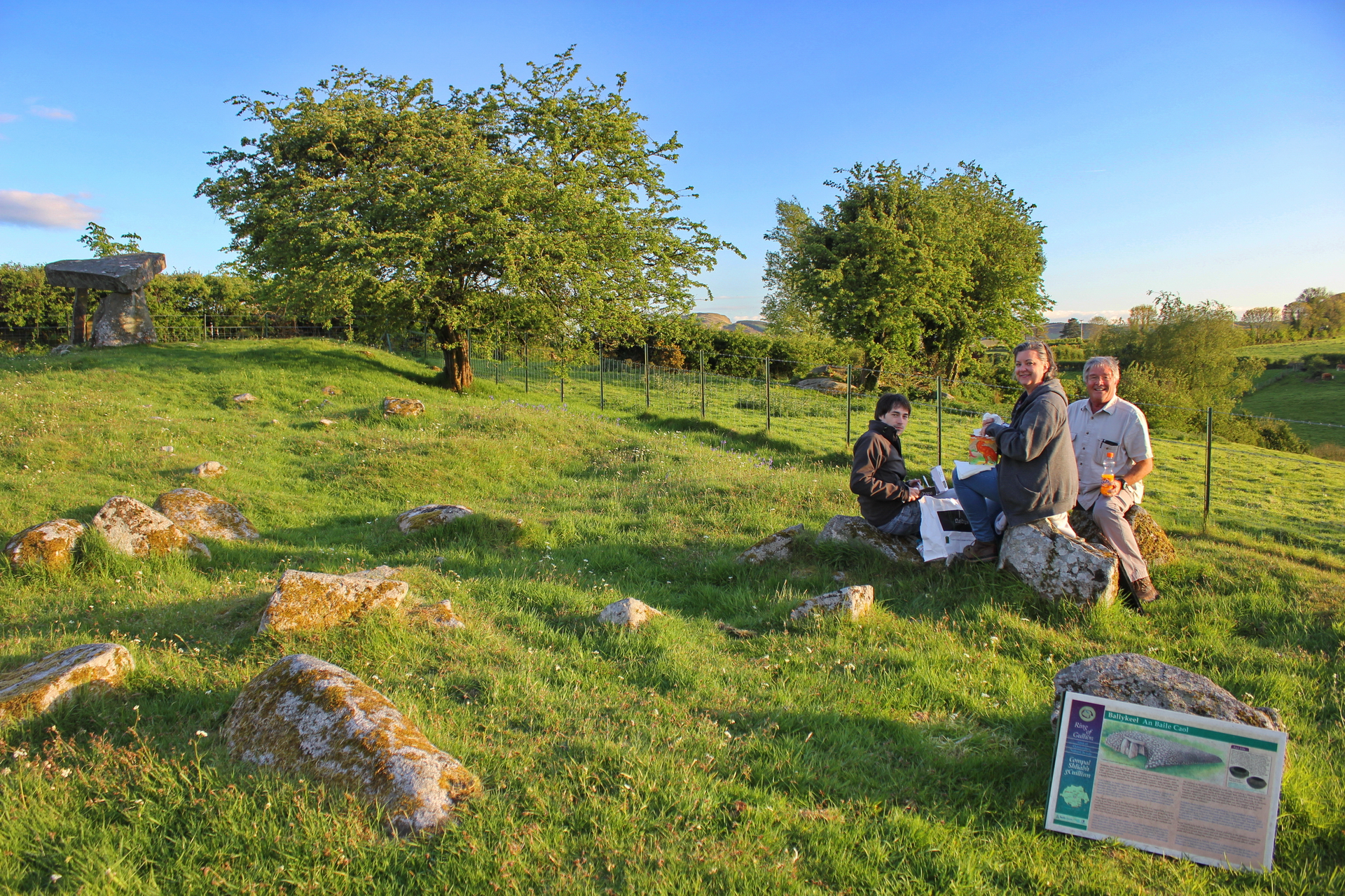 The dolmen lies at the east end of a cairn (pile of stones and dirt) that was built up to and around it in antiquity. It proved a pleasant spot for a sunset picnic dinner in May 2016 with a former student (then studying at Trinity College, Dublin). Takeaway fish and chips (from Fiships in Camlough, Newry) hit the spot!