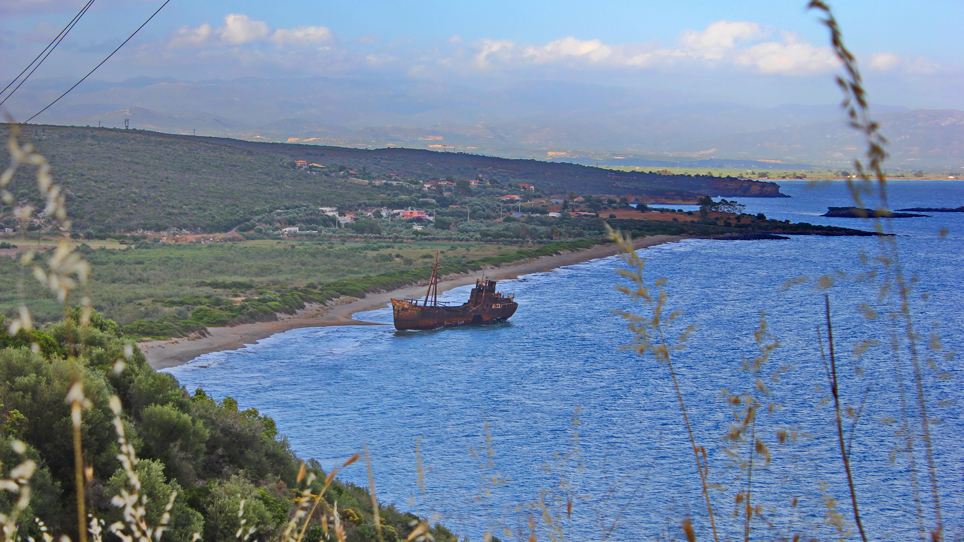 The southern part of mainland Greece is the large and important Peloponnese peninsula. The Peloponnese, in turn, terminates in three finger-like peninsulas pointing south into the Aegean/Mediterranean Sea. The central one is the Mani, whose tip is the southernmost point of mainland Greece. On the east side of the uppermost part of the Mani, there are two very nice straight beaches near Githio. As you come north over the hill from Selinitsa Beach, Valtaki comes into view, with an unusual feature — a semi-beached shipwreck. It is the Dimitrios (Greek Δημήτριος).