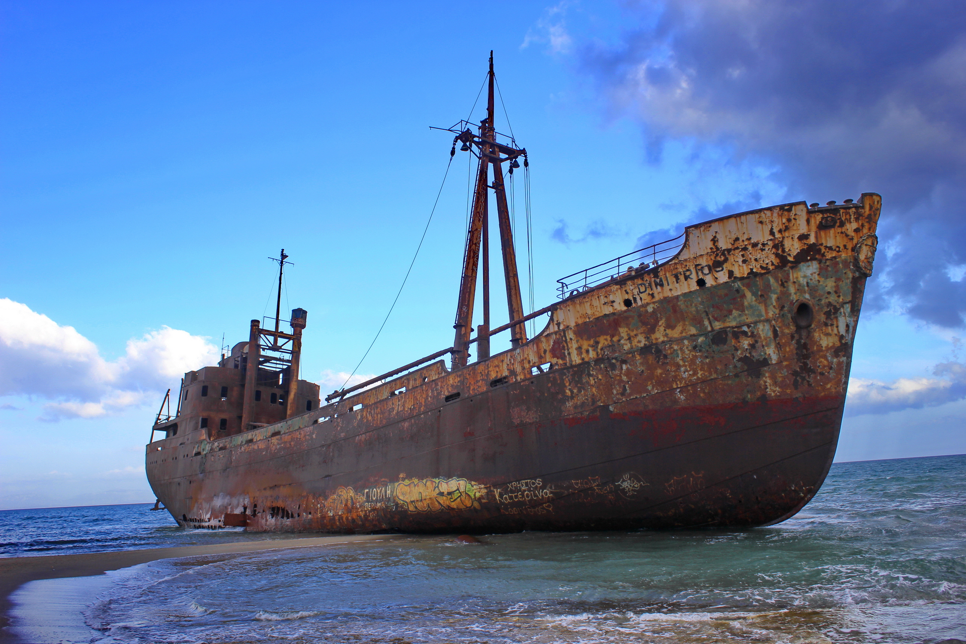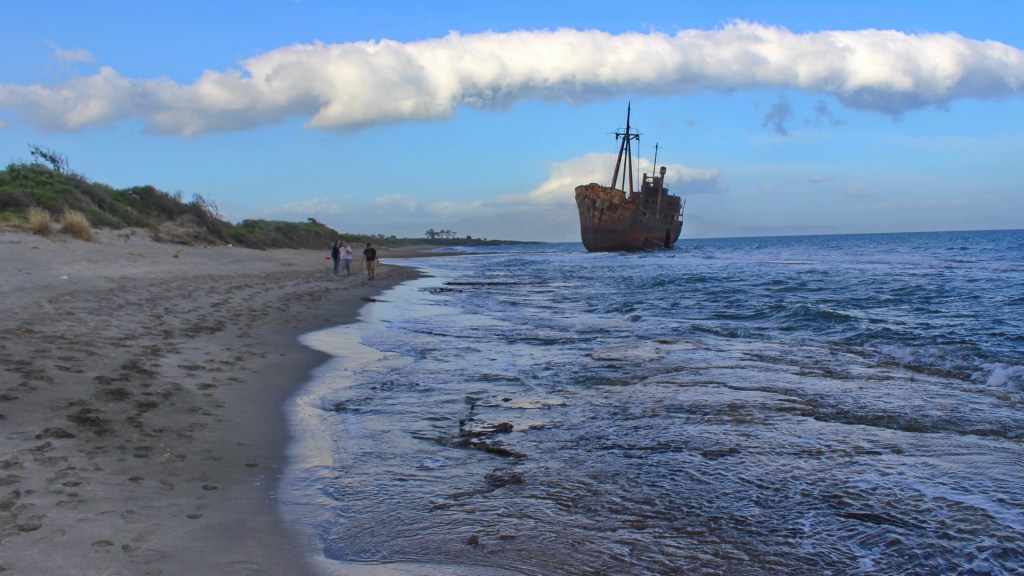 It turns out, however, that the Dimitrios’ story is more mundane and apparently lacks a boastfully inept pilot (Wikipedia has a good overview here). In late 1980 Dimitrios made an emergency stop at Githio, because the captain had a medical emergency. The crew was fired after financial disagreements shut down operations and the ship languished unattended. A year later it broke loose from the dock in severe weather and eventually washed up on Valtaki Beach. There Dimitrios was abandoned.