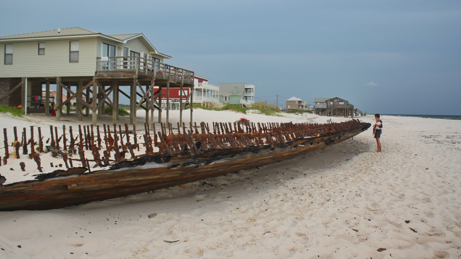 After Hurricane Camille in 1969, a mysterious shipwreck appeared on the Alabama coast five miles east of Fort Morgan. Reclaimed by the sea and sand, it reappeared temporarily after Hurricanes Ivan in 2004, Ike in 2008, and Tropical Storm Ida in 2009. Hurricane Isaac then exposed the wreck more than ever in 2012.[1] Apparently, tropical cyclones with “I” names have a thing for this ship.
