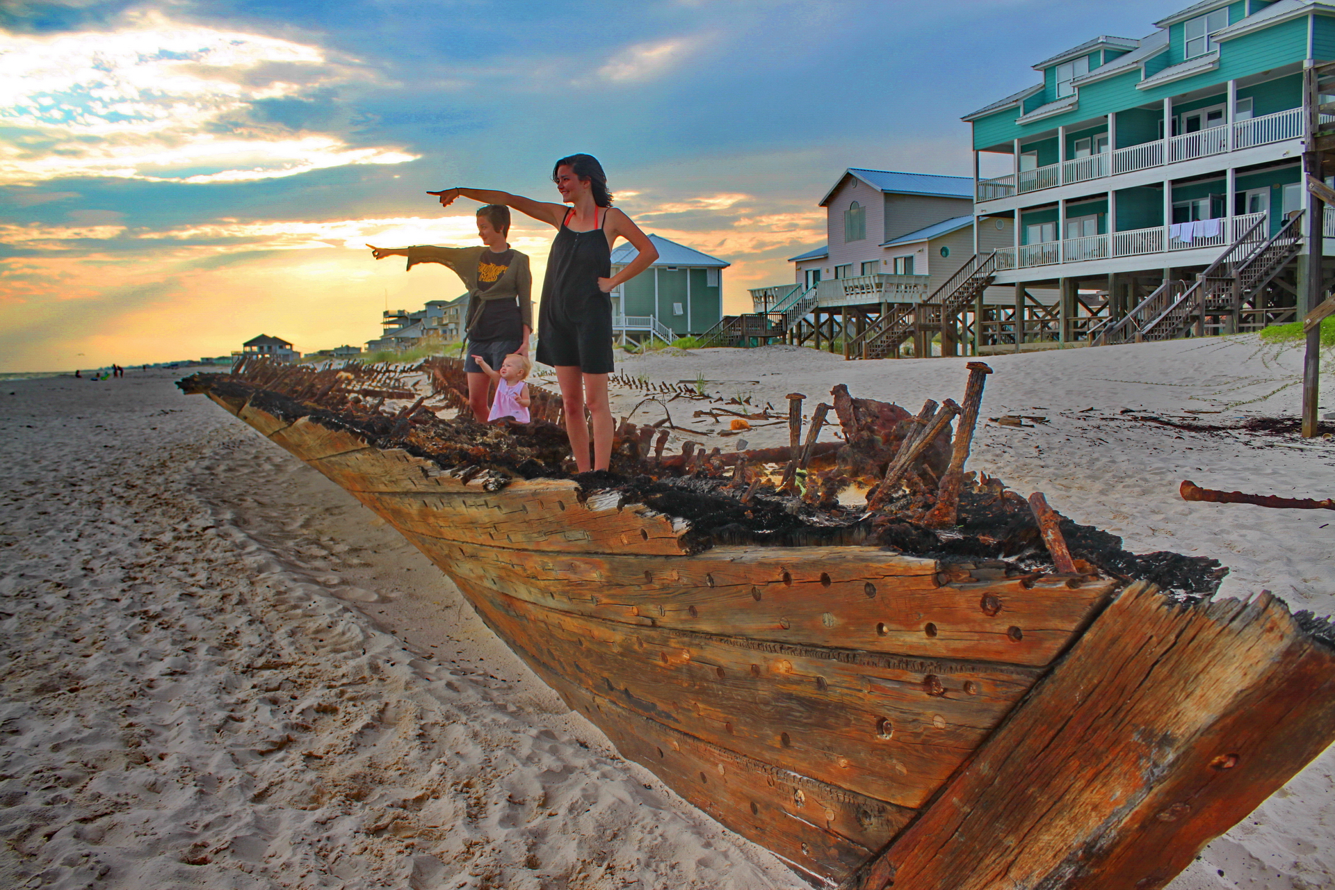 The Rachel’s buyer hired a crew out of Mobile to operate the schooner for hauling lumber (big business in South Mississippi at the time). The first run successfully delivered a load to Cuba, but ran into trouble—the storm, classified as a hurricane—on the return journey. The Rachel was driven aground near Fort Morgan, with no loss of life. The crew emptied the unnamed light cargo and guards were posted to protect the impossibly beached ship until an insurance settlement could be obtained. Unknown parties burned the Rachel down to near the keel after that, presumably to salvage metal parts.[4] Thereafter, the charred hulk was lost to the sand and tide, to sporadically resurface by the same forces that doomed her.