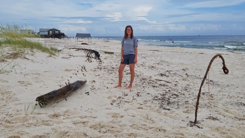 Despite speculation that the wooden ship might be a Confederate blockade runner from the Civil War, Fort Morgan historian Mike Bailey is now certain that the wreck is the Rachel, lost to . . . you guessed it, a tropical storm in 1923.[2] Since the practice of naming storms by sequential alphabet letters had not yet begun, we don’t know if that hurricane would have had a moniker beginning with “I” (but I wouldn’t bet against it).