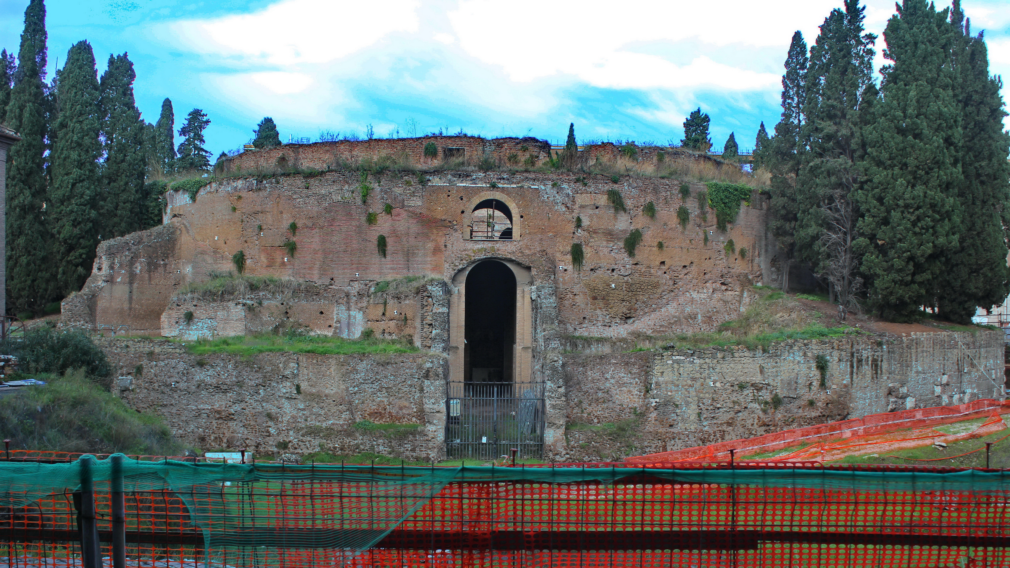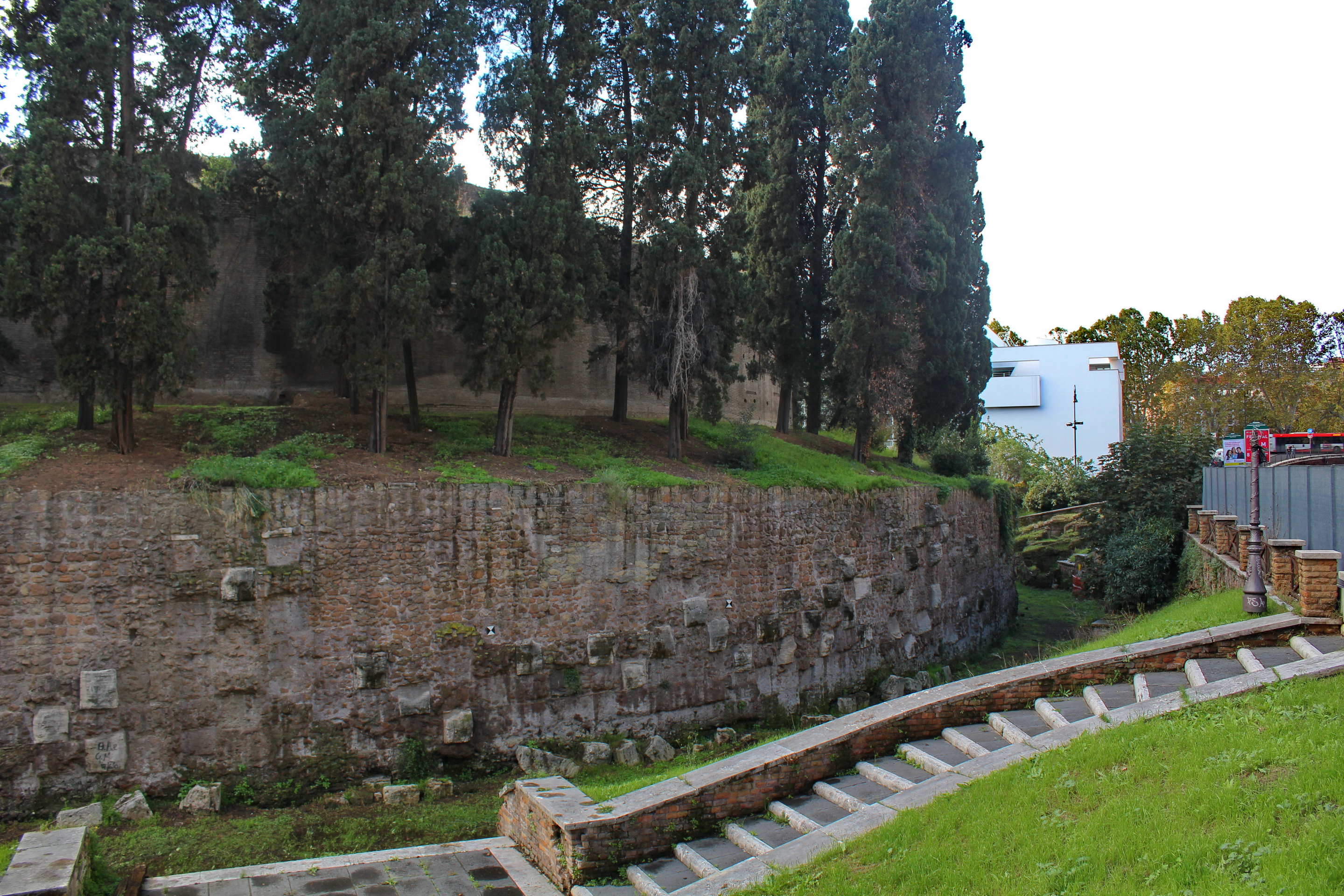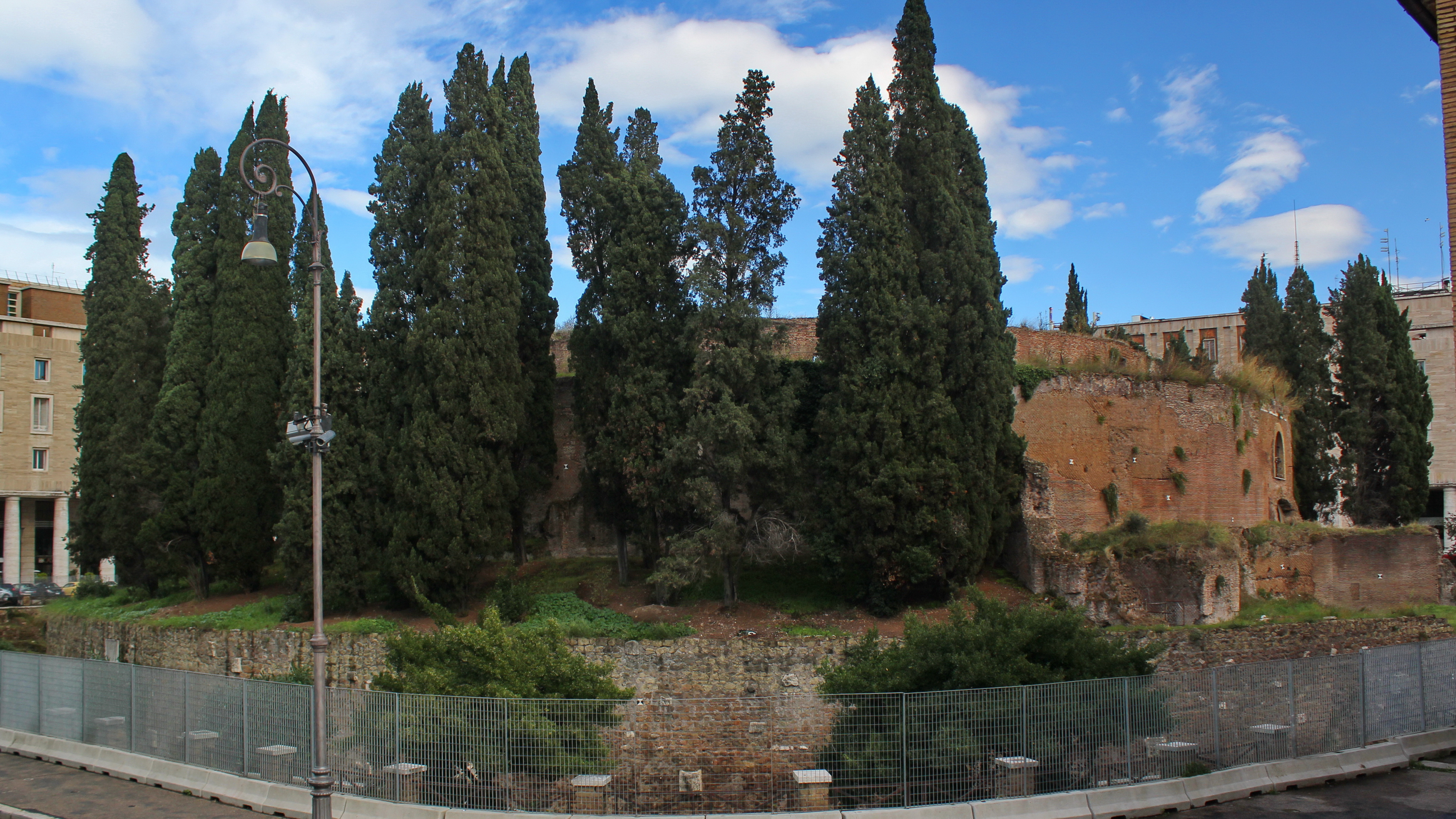Like Trajan after him, Caesar Augustus died on his way back to Rome. His ashes were placed in the huge tomb Octavian (his given name) prepared for himself already in 28 BC, before he even obtained the title Augustus by which he is remembered.[2] It was a huge circular Mausoleum built of concrete and tufa reticulate (small blocks of volcanic conglomerate in a diamond pattern, often as a form for the concrete). The outer of six concentric structural walls measured 300 Roman feet (c. 89m) in diameter, and the 40 Roman feet (c. 12m) high. The 2nd and 3rd walls were consequtively higher and bonded with the outer, making 25m thick ring. A single entrance on the south pierced the outer walls, opening to a vaulted corridor around the 4th wall, through which 2 entrances led to another corridor around the 5th wall, with a single entrance to the burial vault (for urns, as the Romans practiced cremation). The ruined state of the building makes the superstructure details unclear and several reconstructions have been imagined, most assuming a finished overall height of 150 Roman feet (40-45m).
