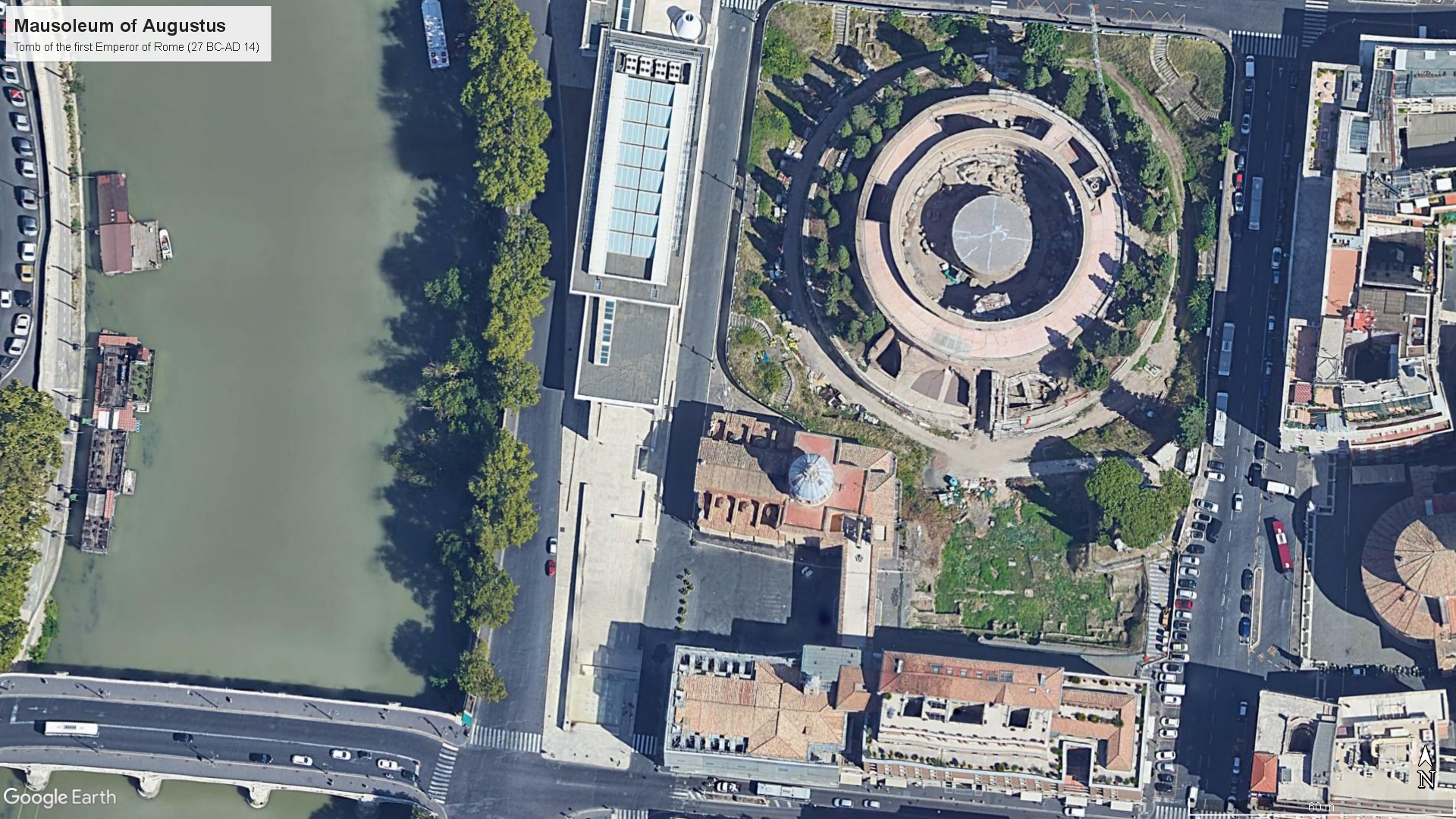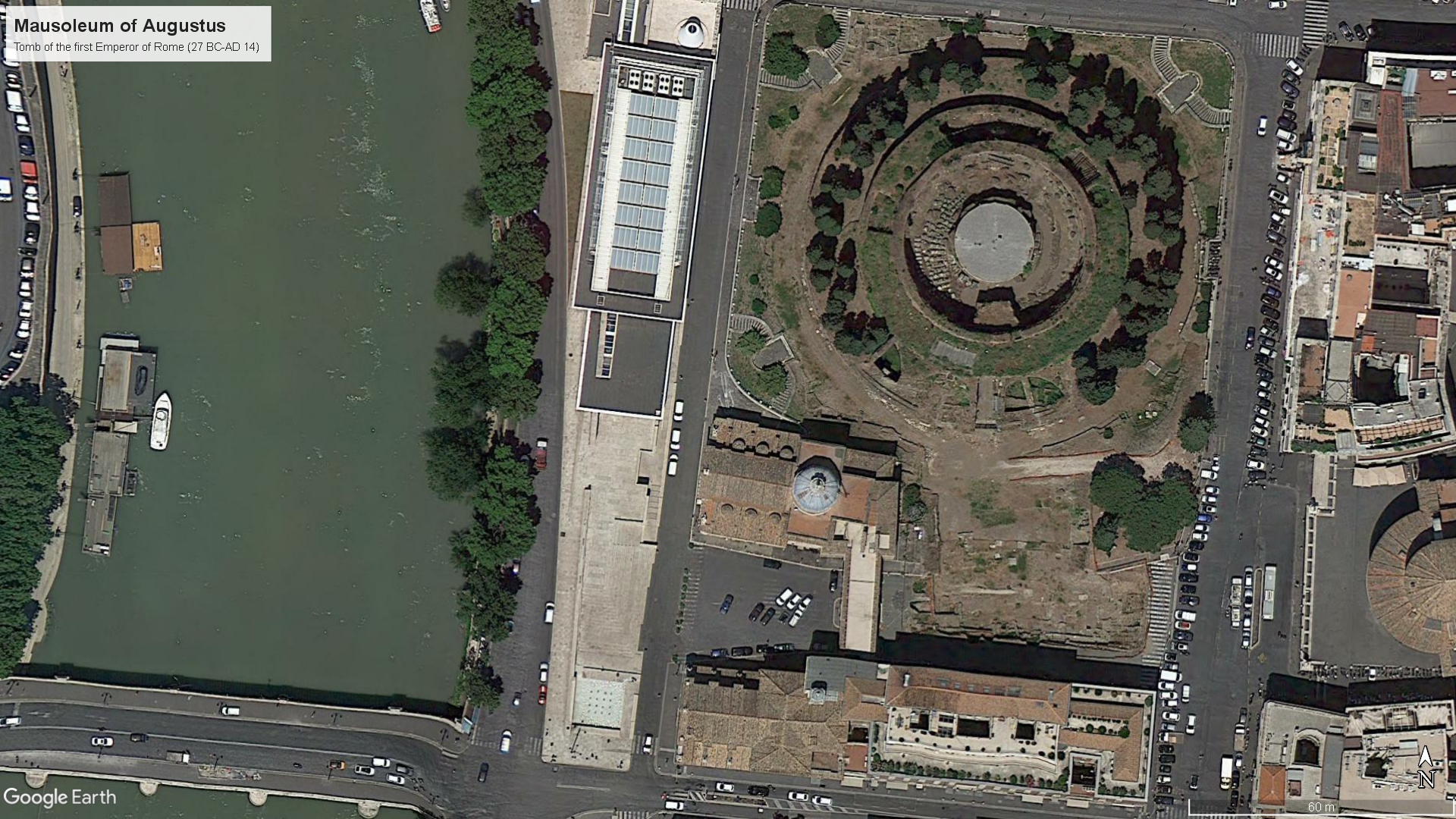 According to Strabo, the Mausoleum was the most impressive of local monuments, “which consists of a mound of earth raised upon a high foundation of white marble, situated near the river, and covered to the top with ever-green shrubs. Upon the summit is a bronze statue of Augustus Cæsar, and beneath the mound are the ashes of himself, his relatives, and friends” (Strabo 5.8.3). One would expect such an impressive monument would be remembered, respected, restored, and revered.