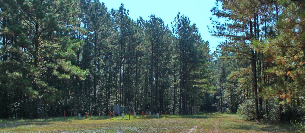 The SGZ monument seems guarded by six closed and securely locked test wells, each in turn protected by concrete-filled security poles. A rusty electrical panel box stands close by (wasps prevented me from testing the outlets in it) next to the stump of a formerly large tree.