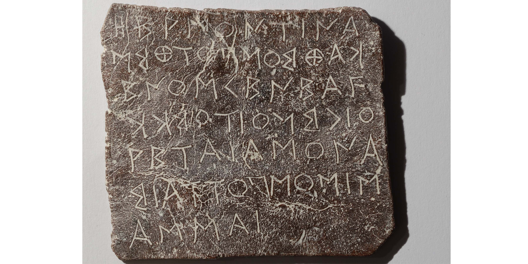Sheet of lead (525 – 500 BC) with a question posed by a visitor named Hermon, inscribed: “who is the god he should pray to in order to acquire useful descendants from his wife Kretaian” (© Acropolis Museum, Athens)