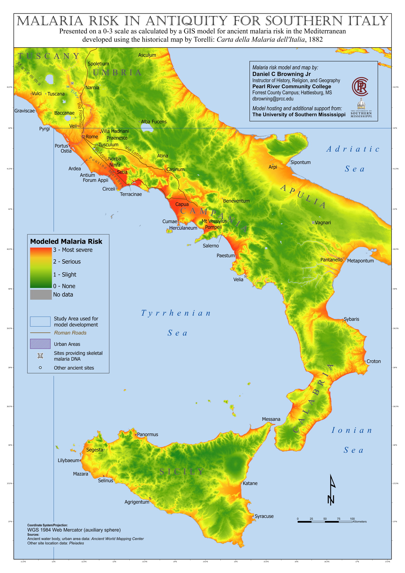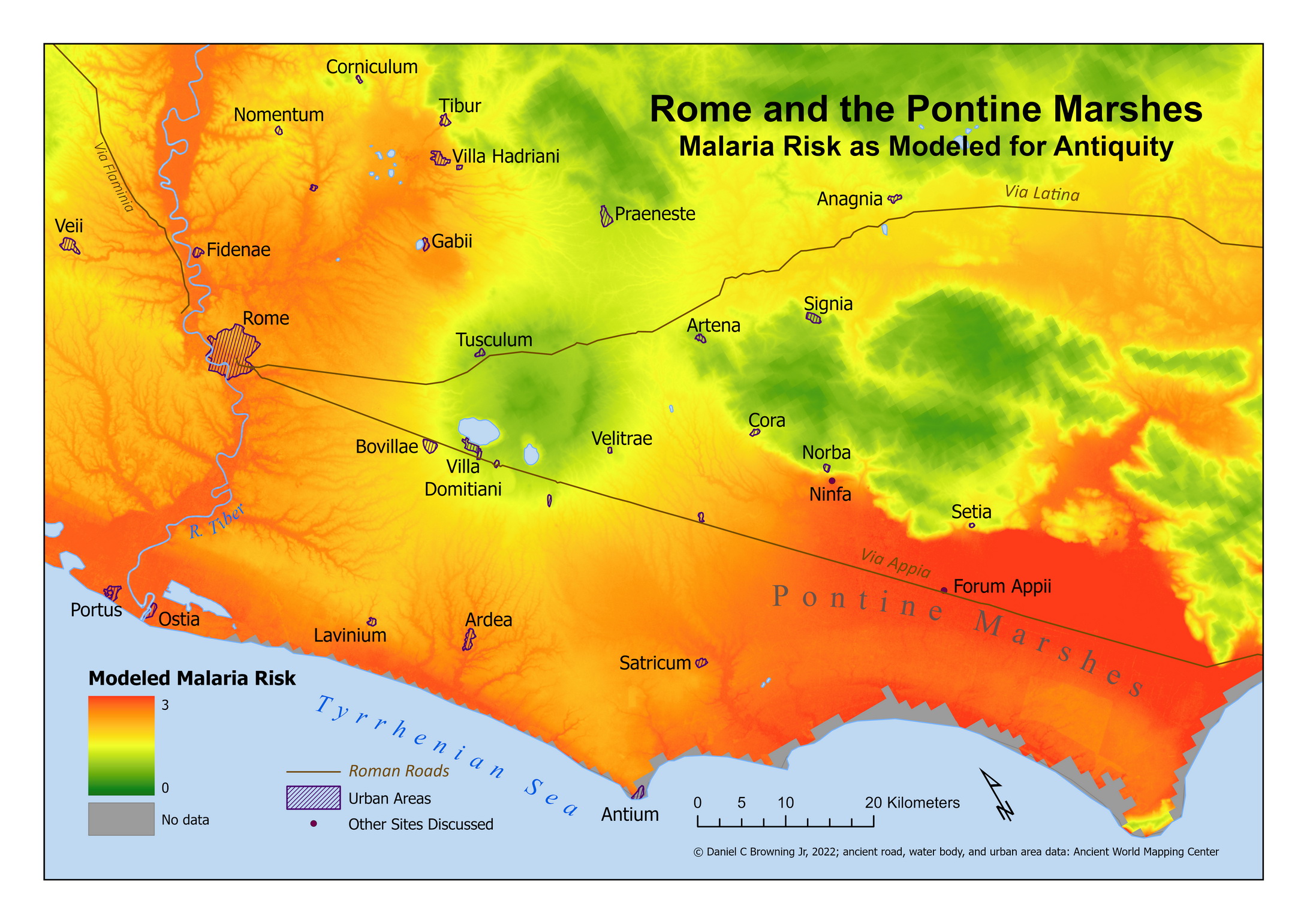 - Browning Jr, Daniel C. “A Malaria Risk Model for the Mediterranean in Antiquity Based on the Historical Carta Della Malaria Dell’Italia.” Journal of Maps 19, no. 1 (2023): 2242724. https://doi.org/10.1080/17445647.2023.2242724.